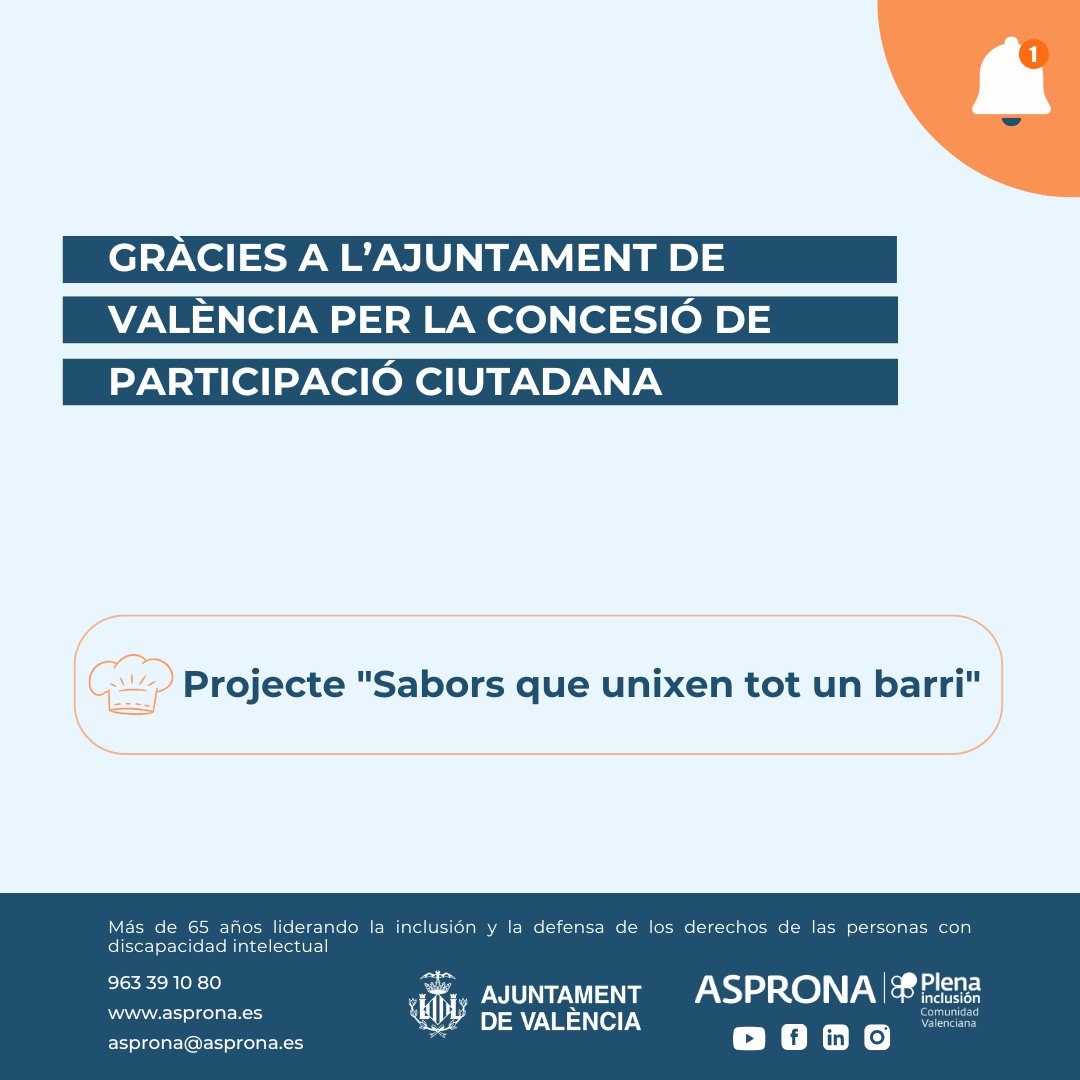 👏Gràcies a @ajuntamentvlc, dins de l'ajuda de Participació Ciutadana 2025, podrem realitzar el projecte "Sabors que unixen tot un barri" amb la colaboració de Rubén Fenollar.