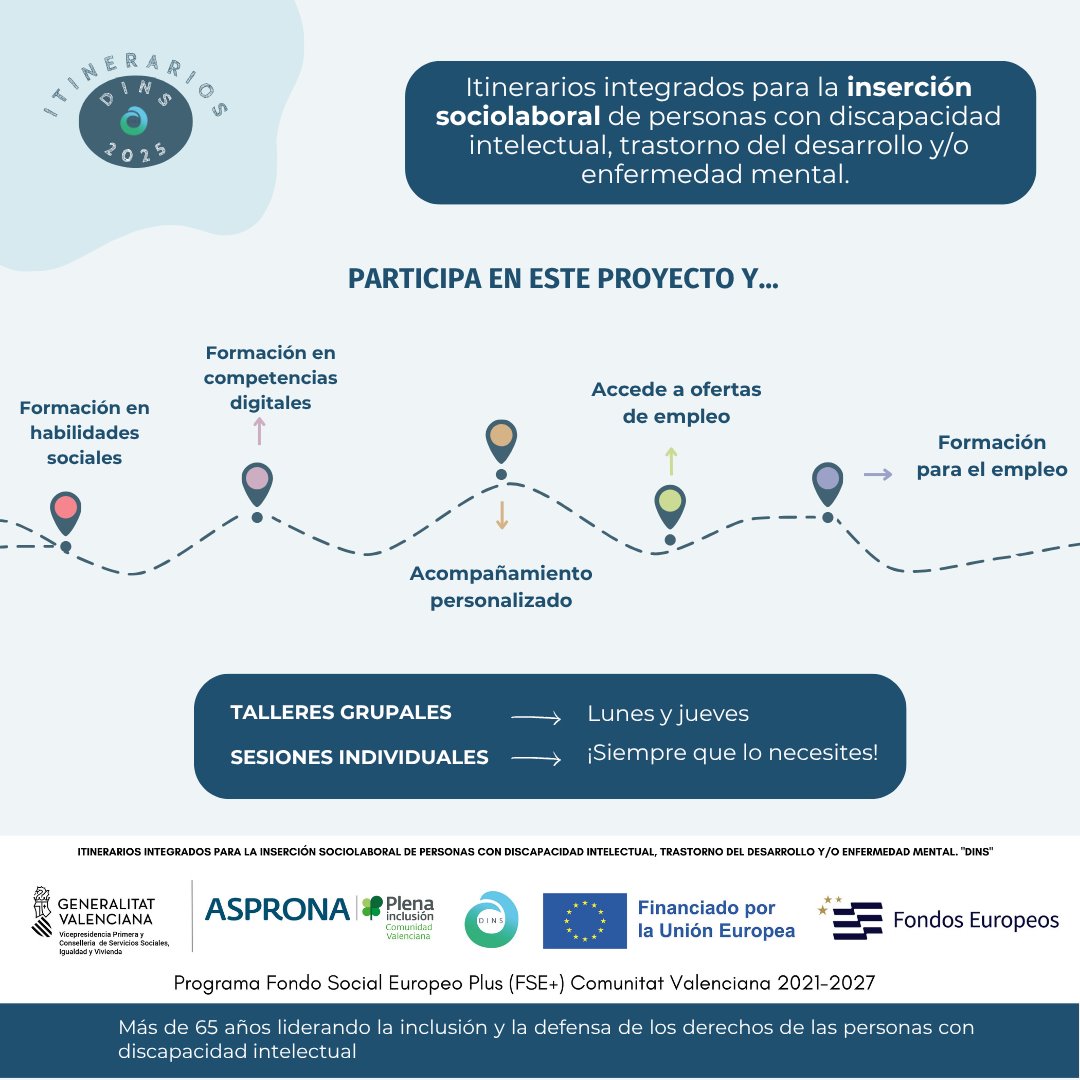 El proyecto Itinerarios DINS está financiado por el Fondo Social Europeo Plus (FSE+) Comunitat Valenciana 2021-2027, con la colaboración de la Generalitat Valenciana, la Unión Europea y ASPRONA Valencia.